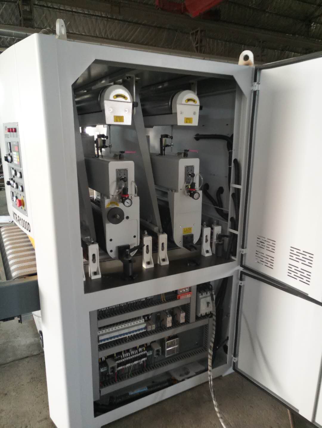 性能特點(diǎn):本底漆砂光機(jī)主要適用于實(shí)木地板、板式家具、復(fù)合板材、實(shí)木門窗、工藝品、仿古地板的漆面砂光及表面精拋光。 -進(jìn)口變頻器調(diào)節(jié)砂帶的線速度,送料系統(tǒng)選用無級變速機(jī) -前砂架為可調(diào)式膠輥,操作簡單,砂偏易調(diào)節(jié),砂架采用鑄造結(jié)構(gòu),變形小,吸震效果好。 -采用25SH天然橡膠彈性大不變形,消除橫紋白邊現(xiàn)象精度高并且使用壽命長 -在出現(xiàn)故障情況下,設(shè)備斷電、剎車、輸送床產(chǎn)生保護(hù)下降,可保護(hù)工件不被破壞 -先進(jìn)的動平衡檢測定厚輥,鋼輥,皮帶輪,使機(jī)器運(yùn)行更加平穩(wěn) -吹塵裝置有效清除砂帶積塵,降溫,延長砂帶使用壽命,提高砂光精度。 -氣壓不足或砂帶斷帶,跑偏時(shí)自動停機(jī),工作臺自動下降確保安全